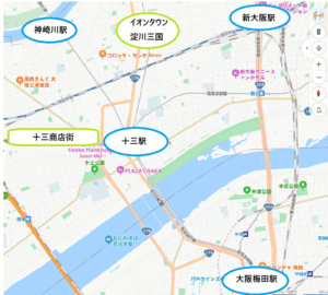 十三駅エリアは大阪市淀川区にあり、大阪の中でもかなり都会で、便利な地域に位置しています。